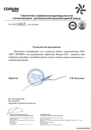 – Corum Group, (финансово-промышленная группа СКМ), «Дружковский машиностроительный завод Горные машины», заполнение лопаток лопастей пенополиуретаном, 2017 г. Рекомендательное письмо;